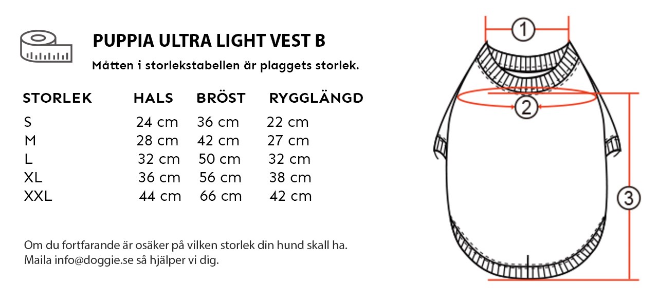 Kontrollera att hundens mått (enligt storlekstabell bland bilderna) passar med plagget. För att välja rätt storlek till din hund, lägg på ca 5 - 10 cm på måttet när du mäter runt bröstkorgen på hunden. För riktigt små hundar under 5 kg är det lagom med ca 3 - 5 cm. Tänk på att ta en större storlek om hunden har mycket päls.