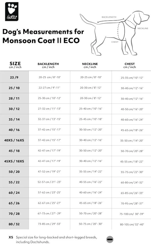 Monsoon II ECO har också helt tejpade vattentäta sömmar för att klara av vinterns blötaste väder. Den justerbara, vattentäta RainStopper-kragen i trikå är extra mjuk och hjälper till att förhindra att vatten tränger in i kragen. Den innovativa designen ger skydd för både hals och bröst. Jackans breda magflik skyddar inte bara hundens mage från lera, sand och vattenstänk, utan håller också regnrocken säkert på plats. De snygga reflexmönstren på jackans bakkant, tillsammans med en reflexrand på bröstet, förbättrar synligheten i mörker och ger dig och din hund ett extra lager av säkerhet, särskilt i trafikerade stadsområden.